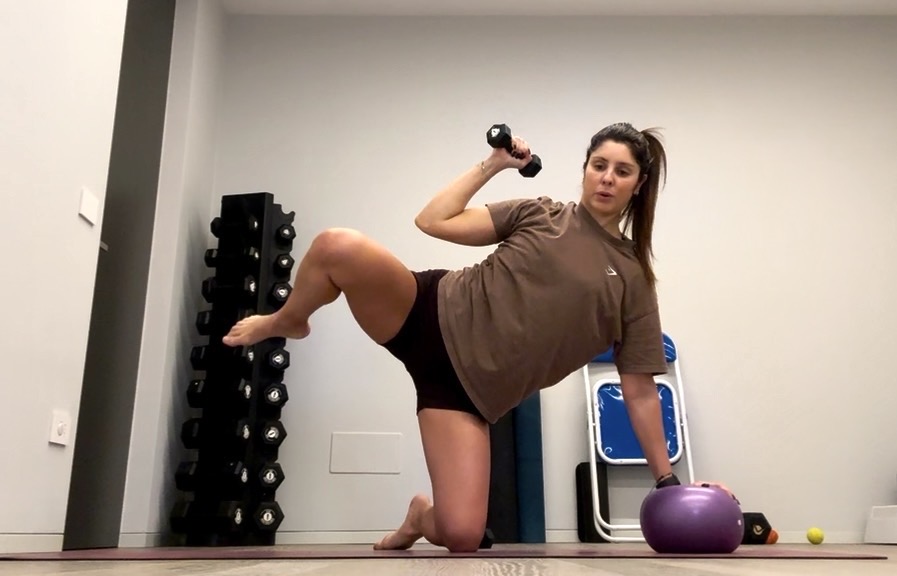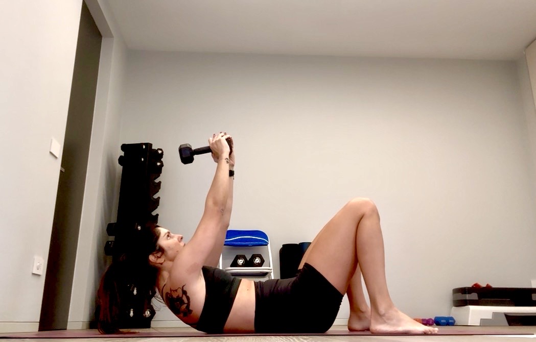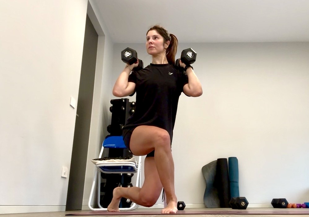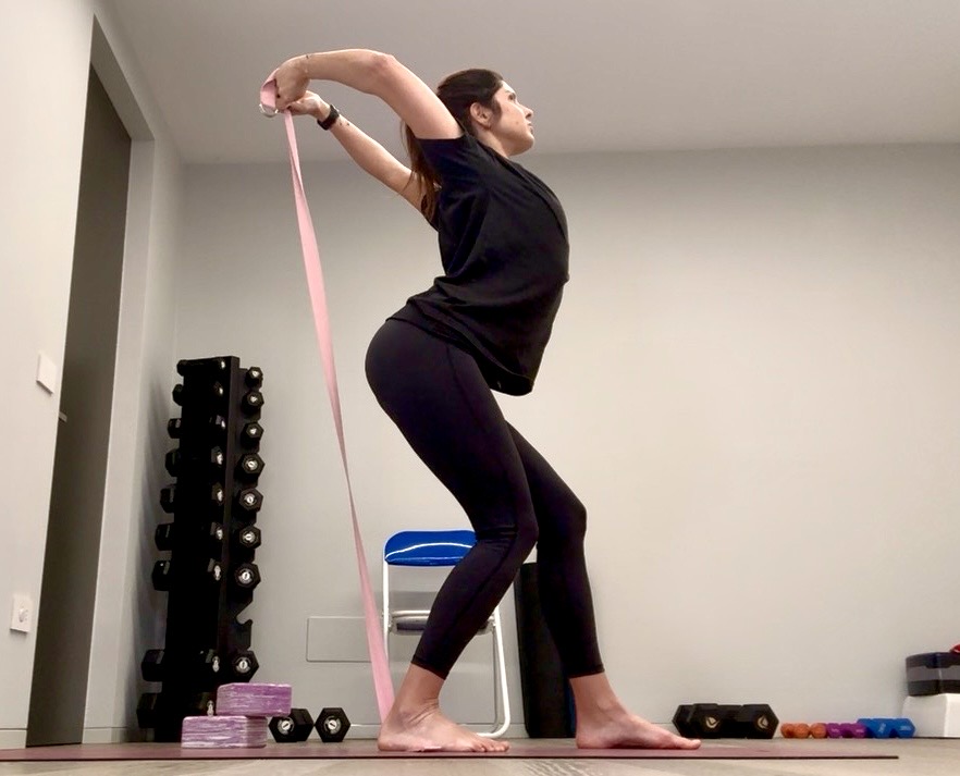 Cosa ti serve: 2 manubri, 1 banda elastica, sedia, blocchetto (o step)